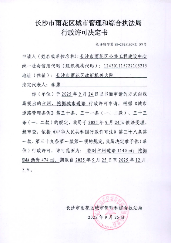 长沙市雨花区公共工程建设中心占用、挖掘城市道路行政许可决定书公示