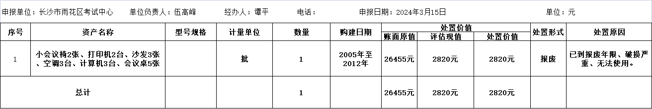 长沙市雨花区考试中心因资产核销所涉及小会议椅、打印机、沙发、空调、计算机、会议桌资产需处置(核销),根据《雨花区行政事业单位国有资产管理实施细则》(雨财发〔2023〕7号)等文件精神,向社会公示。按照该文件要求,现将长沙市雨花区考试中心所需处置(核销)的资产信息、现场勘查等情况(详情见下表),予以公示,公示时间为2024年11月22日至2024年11月28日。