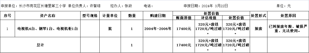 长沙市雨花区长塘里第三小学因资产核销所涉及电视机、钢琴、电视机柜资产需处置(核销),根据《雨花区行政事业单位国有资产管理实施细则》(雨财发〔2023〕7号)等文件精神,向社会公示。按照该文件要求,现将长沙市雨花区长塘里第三小学所需处置(核销)的资产信息、现场勘查等情况(详情见下表),予以公示,2024年11月22日至2024年11月28日。