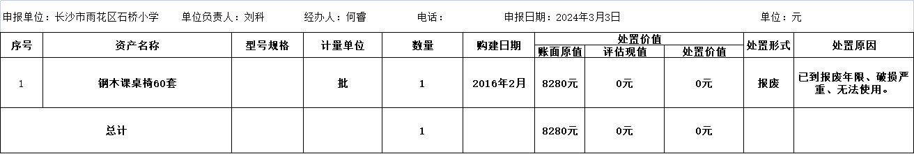 长沙市雨花区石桥小学因资产核销所涉及钢木课桌椅资产需处置(核销),根据《雨花区行政事业单位国有资产管理实施细则》(雨财发〔2023〕7号)等文件精神,向社会公示。按照该文件要求,现将长沙市雨花区石桥小学所需处置(核销)的资产信息、现场勘查等情况(详情见下表),予以公示,公示时间为2024年11月22日至2024年11月28日。