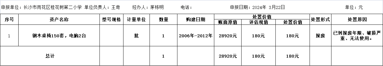 长沙市雨花区桂花树第二小学因资产核销所涉及钢木桌椅、电脑资产需处置(核销),根据《雨花区行政事业单位国有资产管理实施细则》(雨财发〔2023〕7号)等文件精神,向社会公示。按照该文件要求,现将长沙市雨花区桂花树第二小学所需处置(核销)的资产信息、现场勘查等情况(详情见下表),予以公示,公示时间为2024年11月22日至2024年11月28日。