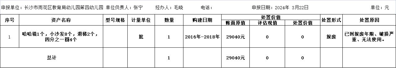 长沙市雨花区教育局幼儿园第四幼儿园因资产核销所涉及哈哈镜、小沙发、滑梯、四分之一圆资产需处置(核销),根据《雨花区行政事业单位国有资产管理实施细则》(雨财发〔2023〕7号)等文件精神,向社会公示。按照该文件要求,现将长沙市雨花区教育局幼儿园第四幼儿园所需处置(核销)的资产信息、现场勘查等情况(详情见下表),予以公示,2024年11月22日至2024年11月28日。
