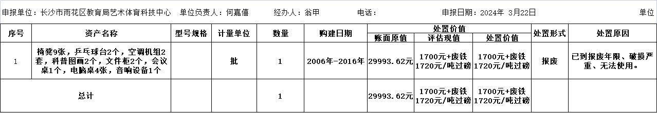 长沙市雨花区教育局艺术体育科技中心因资产核销所涉及椅凳、乒乓球台、空调机组、科普图画、文件柜、会议桌、电脑桌、音响设备资产需处置(核销),根据《雨花区行政事业单位国有资产管理实施细则》(雨财发〔2023〕7号)等文件精神,向社会公示。按照该文件要求,现将长沙市雨花区教育局艺术体育科技中心所需处置(核销)的资产信息、现场勘查等情况(详情见下表),予以公示,2024年11月22日至2024年11月28日。