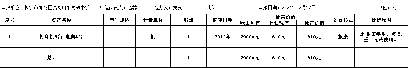 长沙市雨花区枫树山东南海小学因资产核销所涉及打印机、电脑资产需处置(核销),根据《雨花区行政事业单位国有资产管理实施细则》(雨财发〔2023〕7号)等文件精神,向社会公示。按照该文件要求,现将长沙市雨花区枫树山东南海小学所需处置(核销)的资产信息、现场勘查等情况(详情见下表),予以公示,2024年11月22日至2024年11月28日。