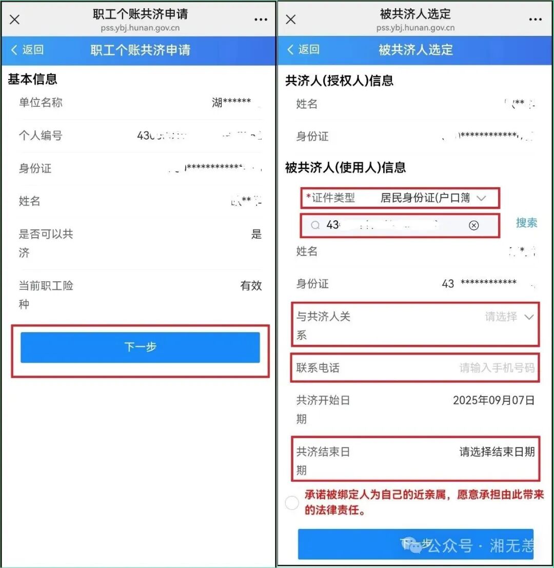 (如前期已绑定共济人可忽略该步)点击“第一步”,确认基本信息后点击“下一步”,选择证件类型,输入相应的证件号码“搜索”,然后选择“与共济人关系”“共济结束日期”,填写联系电话,填写完后点击“下一步”确认绑定。