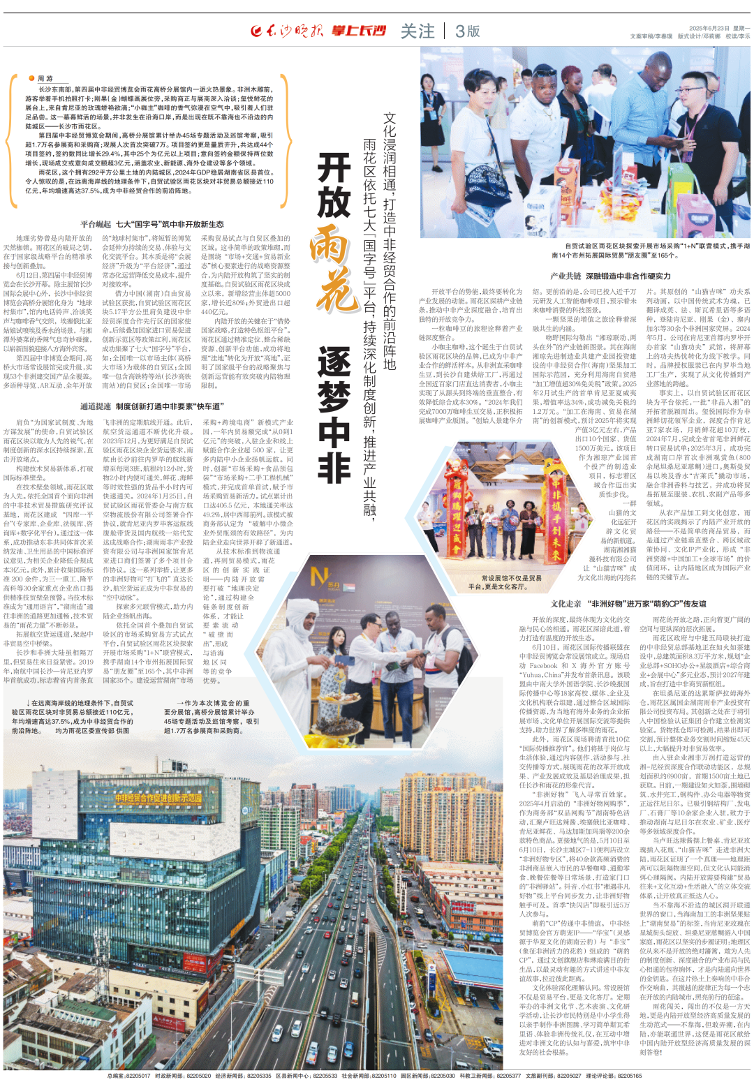 本文刊发于《长沙晚报》2025年6月23日第03版,原标题:开放雨花 逐梦中非 雨花区依托七大“国字号”平台,持续深化制度创新,推进产业共融,文化浸润相通,打造中非经贸合作的前沿阵地。